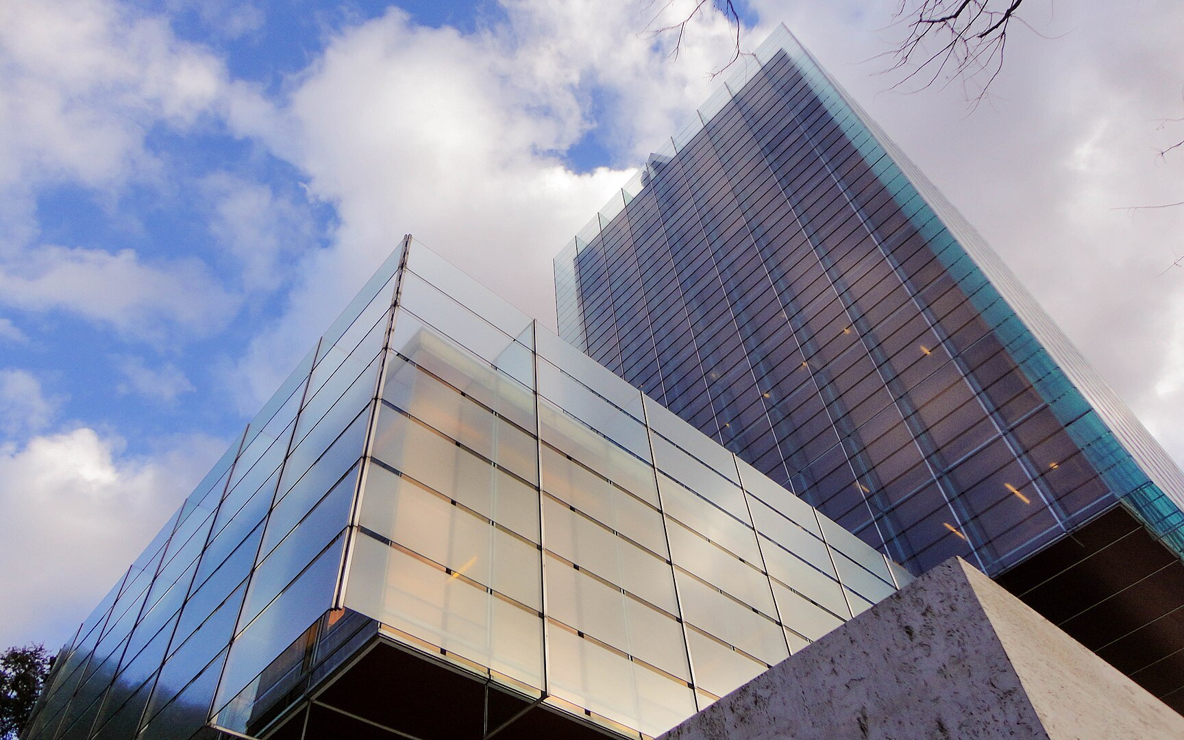 Sobre el solar del desaparecido palacete del vizconde de la Maza, diseñado por Antonio Palacios, se levanta este edificio que está ganando consideración con el tiempo, a pesar de haber sufrido varias molestas alteraciones. Está conformado como un paralelepípedo de vidrio de plantas cuadradas y diáfanas, el cual se cuelga desde la plataforma en ménsula de un núcleo de hormigón de comunicaciones y servicios, que se sitúa descentrado en su parte posterior, pareciendo flotar así sobre un cuerpo horizontal de basamento al que no llega a tocar.